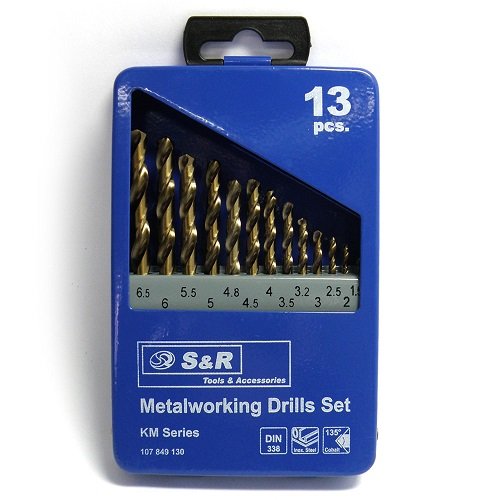 Набор сверл S&R КМ по стандарту Din 338 для сверления сквозных и глухих отверстий в нержавеющих, жаростойких, высоколегированных конструкционных сталях, отбеленном чугуне, титане и его сплавах.