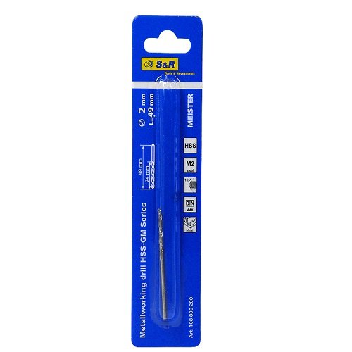 S & R Meister HSS 2.0×49 мм – свердло по металу для свердління отворів в металевих, залізних, пластикових, чавунних поверхнях, а також виробів з кольорового металу. Використовуються свердла з дрилями і свердлильними установками.